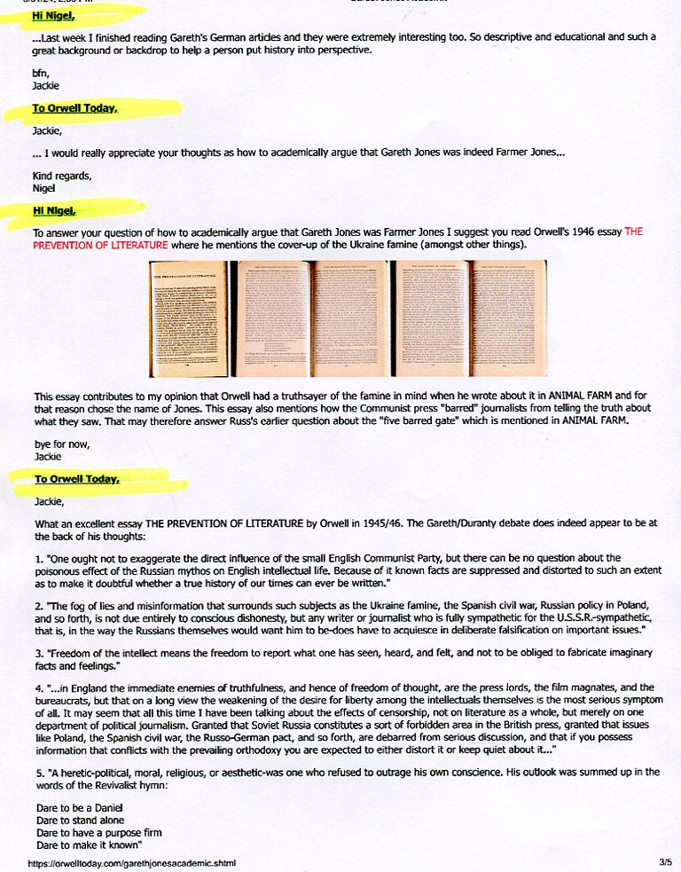 from Jackie: ...To answer your question of how to academically argue that Gareth Jones was Farmer Jones I suggest you read Orwell's 1946 essay THE PREVENTION OF LITERATURE where he mentions the cover-up of the Ukraine famine (amongst other things). This essay contributes to my opinion that Orwell had a truthsayer of the famine in mind when he wrote about it in ANIMAL FARM and for that reason chose the name of Jones. Orwell also mentions how the Communist press barred journalists from telling the truth about what they saw. That may therefore answer an earlier question about the "five barred gate" which is mentioned in ANIMAL FARM.