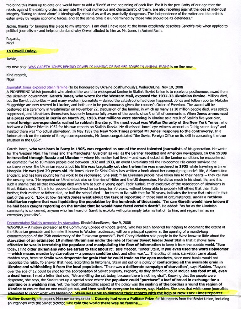 from Jackie: ...I knew without a doubt that Orwell would have read the Soviet articles by Gareth Jones.... It was therefore very thrilling to get your email saying that you think the very same thing. Obviously we're 100% right on! Orwell will be chuckling that we've found that puzzle piece!... How honoured you must be to know that Orwell had your relative in his thoughts when he penned his two great masterpieces.