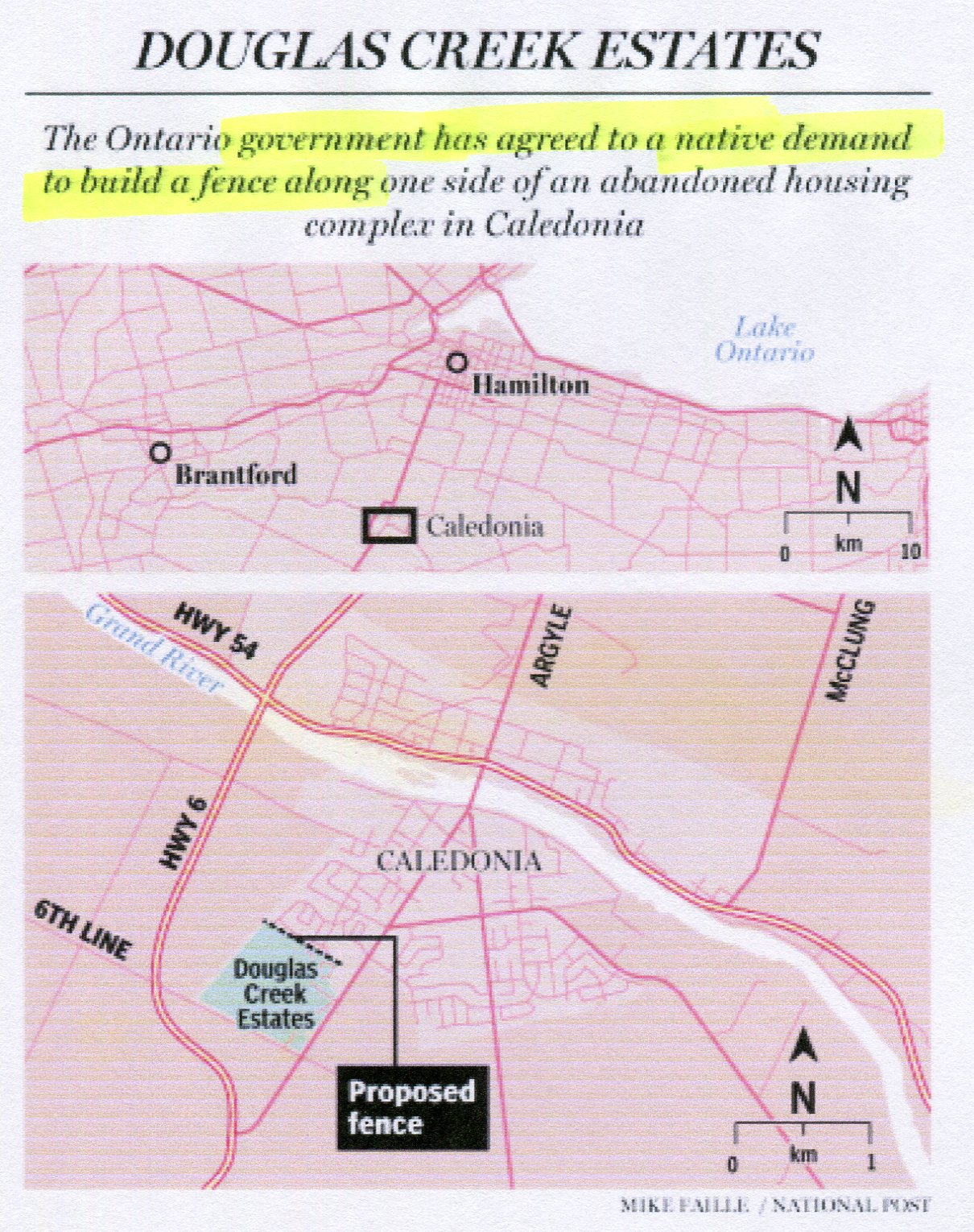 The Ontario government quietly has agreed to a native demand to put up a fence along one side of the old Douglas Creek Estates site in Caledonia, home to one of the longest-running and most violent aboriginal protests in Canadian history.... For locals who have watched in frustration as the province let the disputed land deteriorate over the years, the fence is both evidence that the natives are still calling the shots and an unsettling glimpse of the likely future of the disputed land.