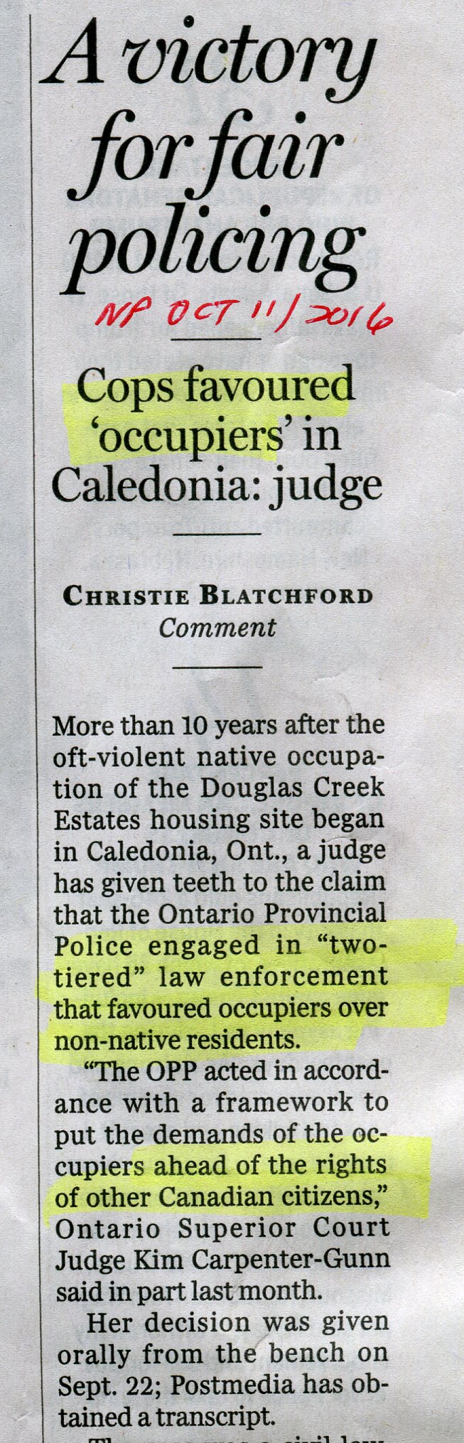 Judge rebukes police for putting 'demands of native occupiers' over other Canadians, by Christie Blatchford, NationalPost, Oct 10, 2016