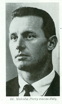Dr. PERRY - Malcolm Oliver Perry. I am a physician and surgeon.... After graduation from High School in 1947, I attended the University of Texas and was duly graduated there in January of 1951 with a degree of Bachelor of Arts. I subsequently graduated from the University of Texas Southwestern Medical School in 1955 with a degree of Doctor of Medicine. I served an internship of 12 months at Letterman Hospital in San Francisco, and after 2 more years in the Air Force I returned to Parkland for a 4-year residency in general surgery. I completed that in June of 1962 and was appointed an instructor in surgery at the Southwestern Medical School. But in September 1962, I returned to the University of California at San Francisco to spend a year in vascular surgery. During that time, I took and passed my boards for the certification for the American Board of Surgery. I returned to Parkland Hospital and Southwestern in September of 1963, was appointed an ssistant professor of surgery, attending surgeon and vascular consultant for Parkland Hospital and John Smith Hospital in Fort Worth.