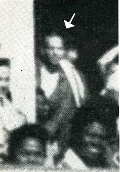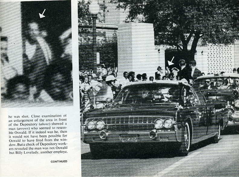 "...Close examination of an enlargement of the area in front of the Depository (above) showed a man (arrows) who seemed to resemble Oswald. If it indeed was he, then it would not have been possible for Oswald to have fired from the window. But a check of Depository workers revealed the man was not Oswald but Billy Lovelady*, another employee."
