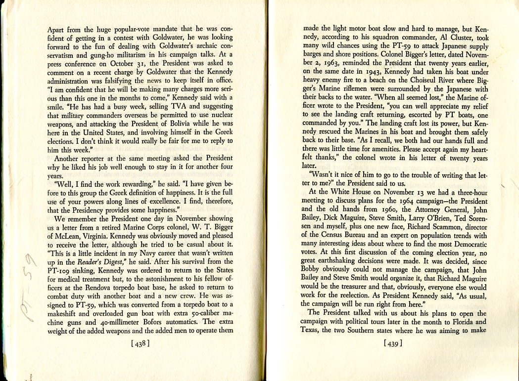 We remember the President one day in November showing us a letter from a retired Marine Corps colonel, W. T. Bigger of McLean, Virginia. Kennedy was obviously moved and pleased to receive the letter, although he tried to be casual about it. "This is a little incident in my Navy career that wasn't written up in the Reader's Digest," he said. After his survival from the PT-109 sinking Kennedy was ordered to return to the States for medical treatment but, to the astonishment of his fellow officers at the Rendova torpedo boat base, he asked to return to combat duty with another boat and a new crew. He was assigned to PT-59, which was converted from a torpedo boat to a makeshift and overloaded gun boat with extra 50-caliber machine guns and 40-millimeter Bofors automatics. The extra weight of the added weapons and the added men to operate them made the light motor boat slow and hard to manage, but Kennedy, according to his squadron commander, Al Cluster, took many wild chances using the PT-59 to attack Japanese supply barges and shore positions. Colonel Bigger's letter, dated November 2, 1963, reminded the President that twenty years earlier, on the same date in 1943, Kennedy had taken his boat under heavy enemy fire to a beach on the Choiseul River where Bigger's Marine riflemen were surrounded by the Japanese with their backs to the water. "When all seemed lost," the Marine officer wrote to the President, "you can well appreciate my relief to see the landing craft returning, escorted by PT boats, one commanded by you." The landing craft lost its power, but Kennedy rescued the Marines in his boat and brought them safely back to their base. "As I recall, we both had our hands full and there was little time for amenities. Please accept again my heartfelt thanks," the colonel wrote in his letter of twenty years later.