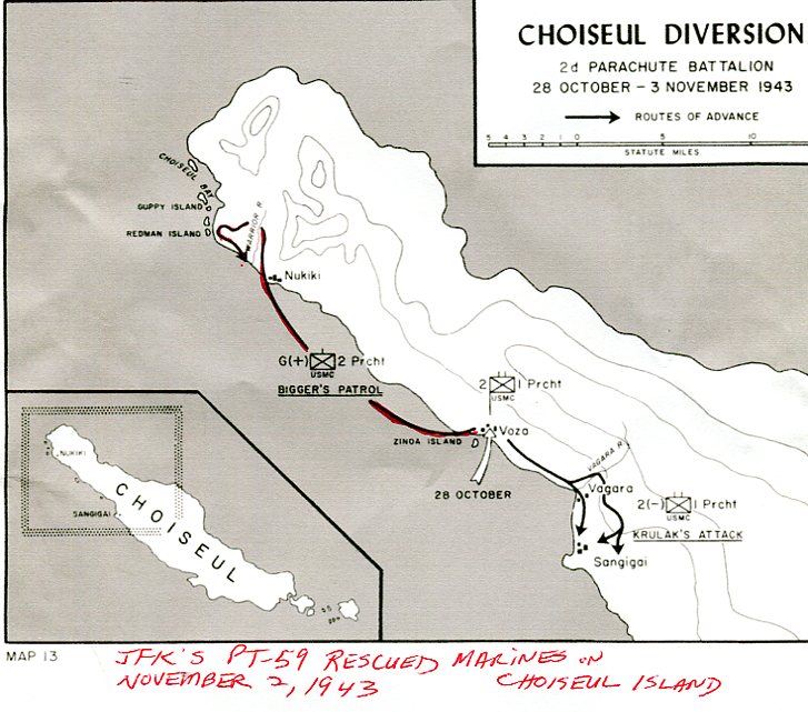 ...When PT-59 arrived at Vella Lavella on October 18, it was sent out on patrol with two other PT boats across the New Georgia Sound to the northwestern tip of Choiseul Bay on Choiseul Island, an important Japanese barge base. The PT boats were ordered to block the western and southern approaches to Choiseul Bay and intercept barges. At this point the Japanese were frantically moving troops by barge in anticipation of American landings in the northern Solomons. Kennedy, now promoted to full lieutenant, took PT-59 on eight similar patrols during the next ten nights. On November 1, Kennedy participated in a rescue mission to Choiseul Island where Marines, part of Lt-Colonel Victor H Krulak's Second Marine Parachute Battalion (1st Marine Parachute Regiment, First Marine Amphibious Corps) had been surrounded by Japanese forces, and needed to be evacuated. This mission was a successful one, although one of the wounded Marines died in Kennedy's bunk aboard PT-59. Interestingly, this dramatic rescue mission was depicted in the PT-109 movie as having been accomplished by PT-109.