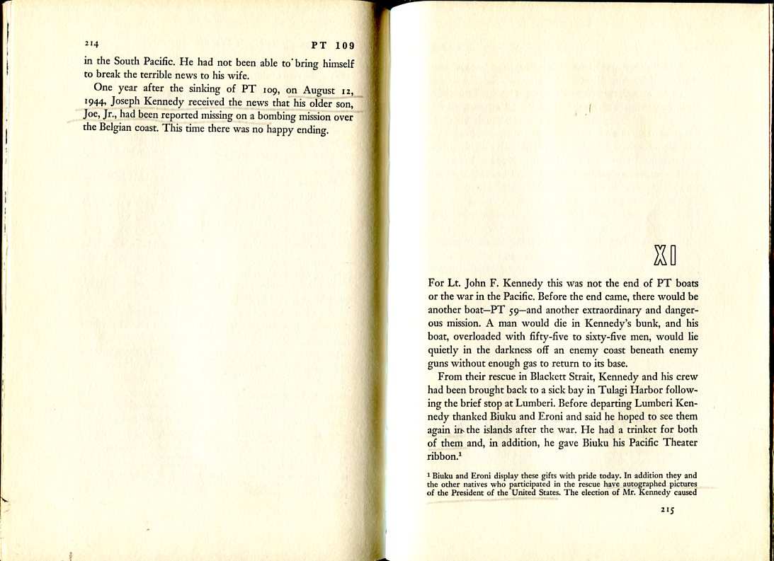 *When in the preparation of this book calls were made to Colonel Bigger and Dr. Stevens to solicit their recollection of those events, neither man had the slightest idea of the identity of the PT skipper who had rescued them in the dark off Choiseul. When they were told it was President Kennedy they were incredulous. "You're pulling my leg" Dr. Stevens reprimanded me.