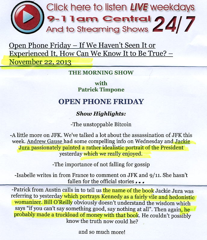 Open Phone Friday, November 22, 2013 (Patrick from Austin calls in to tell us the name of the book -- KILLING KENNEDY -- that Jackie Jura was referring to yesterday which portrays Kennedy as a fairly vile and hedonistic womanizer. Bill O'Reilly obviously doesn't understand the wisdom which says "If you can't say something good, say nothing at all". Then again, he probably made a truckload of money with that book. He couldn't possibly know the truth now could he?...)