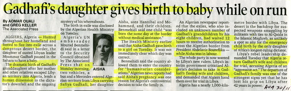 Gadhafi's daughter gives birth to baby while on run, AP, Aug 30, 2011