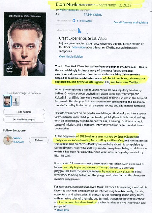 ELON MUSK, by Walter Isaacson (Ahead of its publication, the book topped Amazon's bestseller list. It debuted at number one on The New York Times nonfiction best-seller list for the week ending September 16, 2023... The New Yorker wrote that "Isaacson's new biography depicts a man who wields more power than almost any other person on the planet but seems estranged from humanity itself"...)