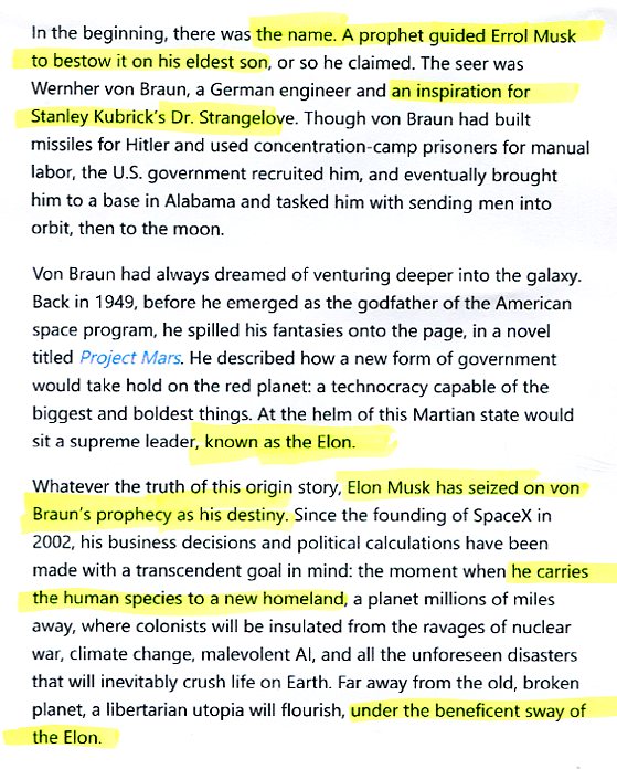 In the beginning, there was the name. A prophet guided Errol Musk to bestow it on his eldest son, or so he claimed. The seer was Wernher von Braun, a German engineer and an inspiration for Stanley Kubrick's Dr. Strangelove. Though von Braun had built missiles for Hitler and used concentration-camp prisoners for manual labor, the USA government recruited him, and eventually brought him to a base in Alabama and tasked him with sending men into orbit, then to the moon. Von Braun had always dreamed of venturing deeper into the galaxy. Back in 1949, before he emerged as the godfather of the American space program, he spilled his fantasies onto the page, in a novel titled PROJECT MARS. He described how a new form of government would take hold on the red planet: a technocracy capable of the biggest and boldest things. At the helm of this Martian state would sit a supreme leader, known as the Elon.