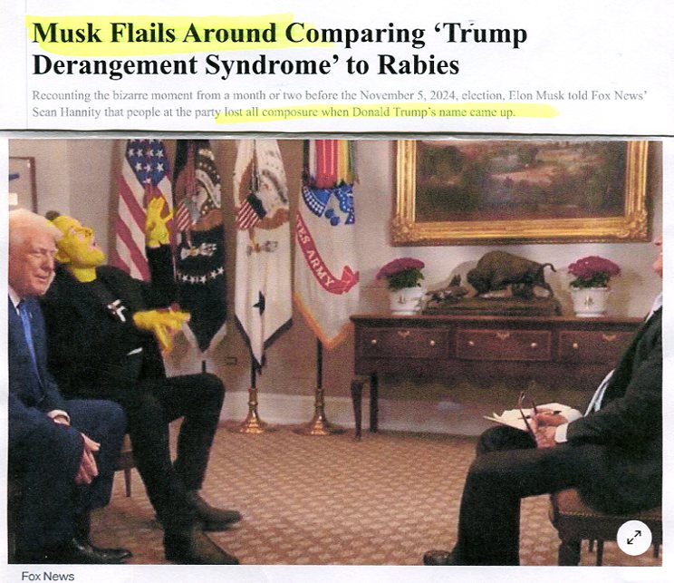 Spastic, twitching Musk compares "Trump Derangement Syndrome" to "getting shot with a dart containing methamphetamine & rabies", White House, February 18, 2025 (...In Sean Hannity interview the 47th president and billionaire Tesla/SpaceX CEO sat together and spoke about the work of DOGe...)