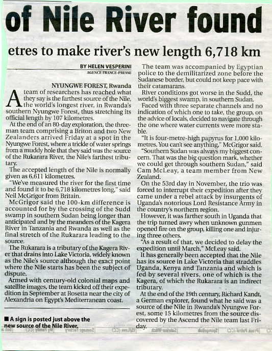 Another reason I was intriqued about being in Nyungwe Forest is that it had just recently been discovered as the source of the Nile. Click twice on article below to enlarge for reading:
