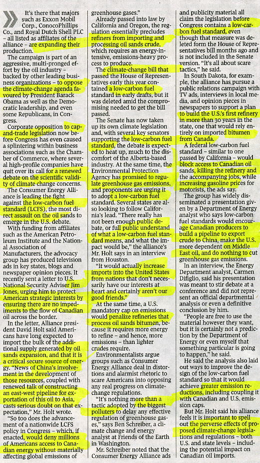 The Houston-based Consumer Energy Alliance has a grim message for those who propose to restrict USA access to Canada's oil sands production to cut greenhouse gas emissions: If the USA doesn't buy the Alberta crude, China will. As a result, such measures would not advance the global fight against climate change, it says. But the USA would be more dependent on Middle East oil, "Communist China" would be siphoning off secure North American crude supplies, and motorists would face higher prices, the alliance warns in a campaign aimed at supporting expansion of imports from the oil sands. As the USA moves to adopt climate change legislation and prepares for negotiations in Copenhagen toward a new global treaty, environmentalists have stepped up their attacks on Canada's oil sands as emblematic of the world's reliance on "dirty" fuels. With the U.S. Senate set to take up debate on climate change legislation this week, the American oil industry is fighting back, both directly and through proxy groups like the Consumer Energy Alliance. When Prime Minister Stephen Harper visited Washington recently, the American Petroleum Institute took out ads in major newspapers, extolling the contribution that oil sands will make to USA energy security and noting that per-barrel emissions from the oil sands have dropped dramatically since 1990...