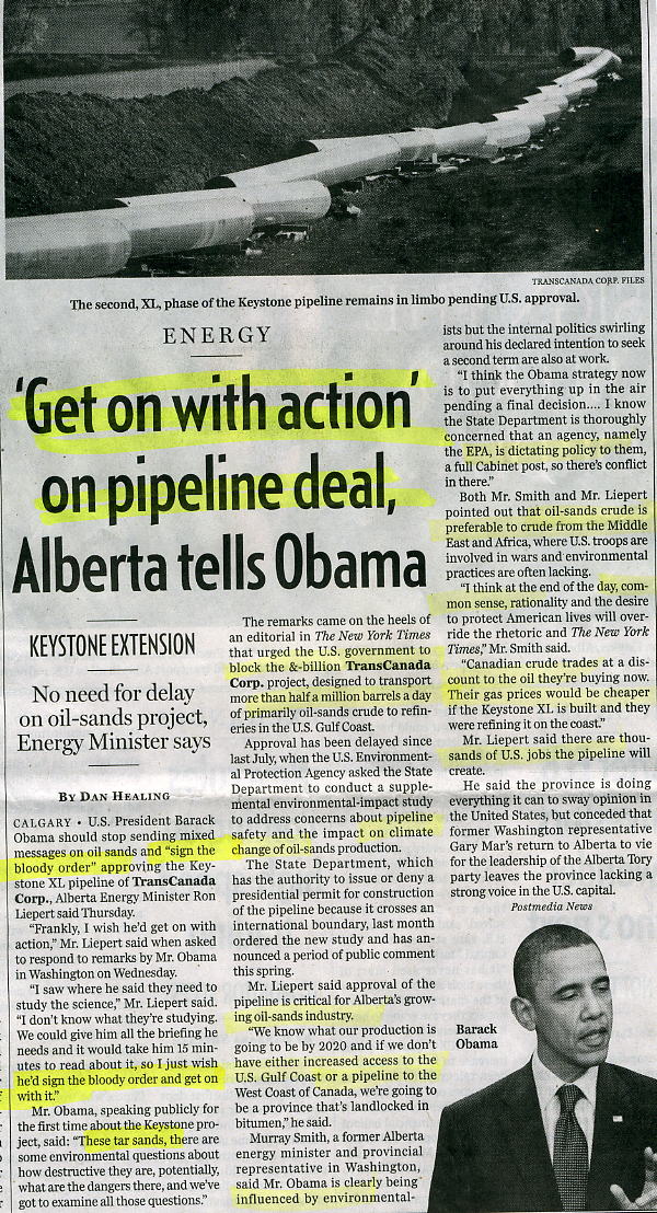 USA President Barack Obama should stop sending mixed messages on oil sands and "sign the bloody order" approving the Keystone XL pipeline of TransCanada Corp., Alberta Energy Minister Ron Liepert said Thursday. "Frankly, I wish he'd get on with action," Mr. Liepert said when asked to respond to remarks by Mr. Obama in Washington on Wednesday.... The remarks came on the heels of an editorial in The New York Times that urged the U.S. government to block the TransCanada Corp. project, designed to transport more than half a million barrels a day of primarily oil-sands crude to refineries in the U.S. Gulf Coast....Murray Smith, a former Alberta energy minister and provincial representative in Washington, said Mr. Obama is clearly being influenced by environmentalists but the internal politics swirling around his declared intention to seek a second term are also at work.... Both Mr. Smith and Mr. Liepert pointed out that oil-sands crude is preferable to crude from the Middle East and Africa, where USA troops are involved in wars and environmental practices are often lacking. "I think at the end of the day, common sense, rationality and the desire to protect American lives will override the rhetoric and The New York Times," Mr. Smith said. "Canadian crude trades at a discount to the oil they're buying now. Their gas prices would be cheaper if the Keystone XL is built and they were refining it on the coast." Mr. Liepert said there are thousands of USA jobs the pipeline will create....
