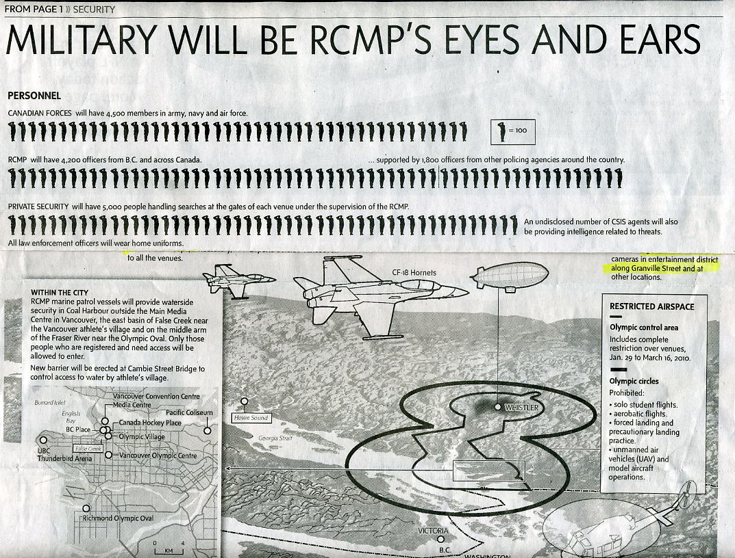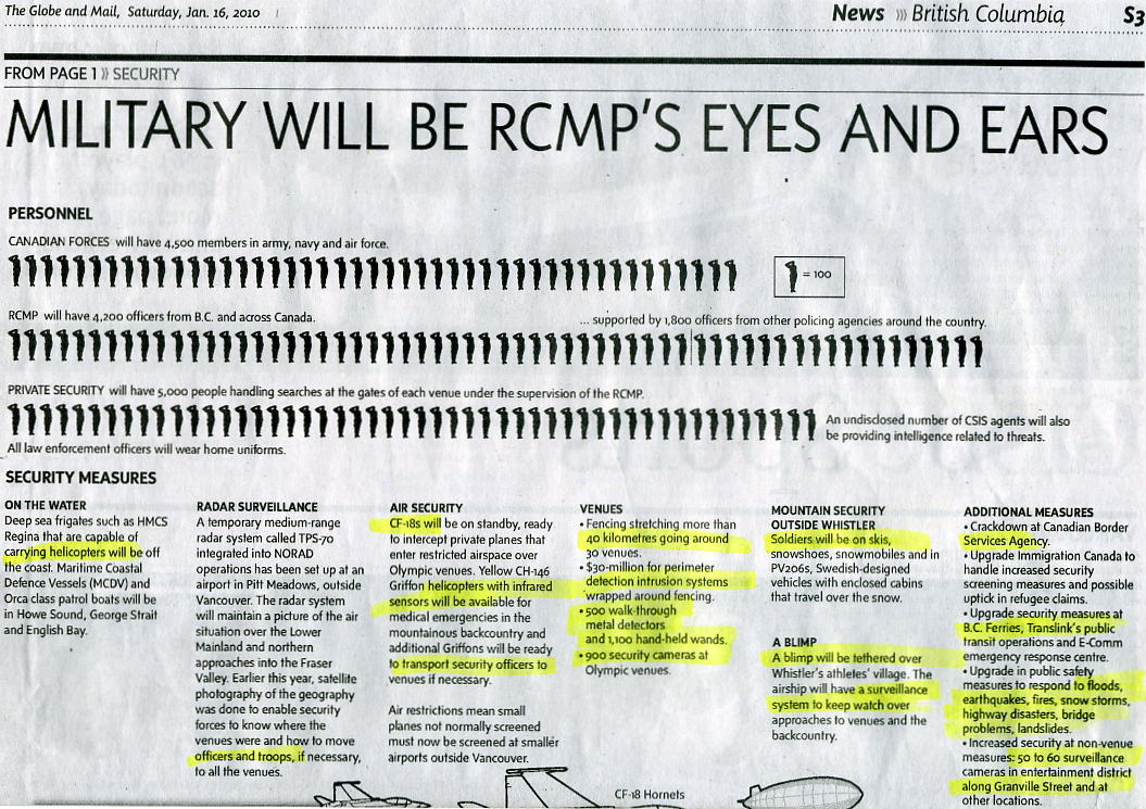 Whenever I read or see the news these days - about the massive police-state military-war-zone the powers-that-be are setting up in Canada's third-largest city under the guise of "keeping people safe from terrorists who might attack us during the Olympic Games" - I'm reminded of the 60's Buffalo Springfield song "There's Something Happening Here" with the line "What a field day for the heat, thousands of people in the street....".