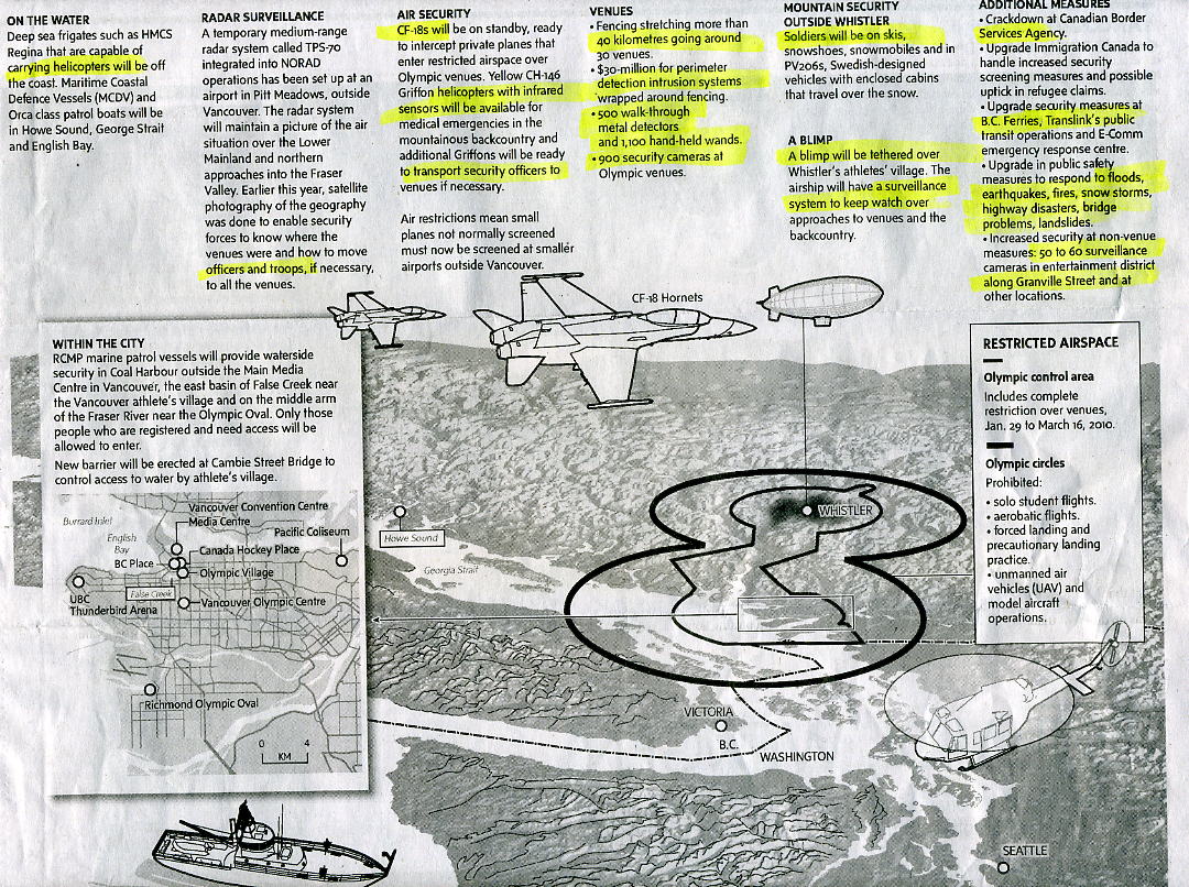 AIR SECURITY - CF-18s will be on standby, ready to intercept private planes that enter restricted airspace over Olympic venues. Yellow CH-146 Griffon helicopters with infrared sensors will be available for medical emergencies in the mountainous backcountry and additional Griffons will be ready to transport security officers to venues if necessary. Air restrictions mean small planes not normally screened must now be screened at smaller airports outside Vancouver.