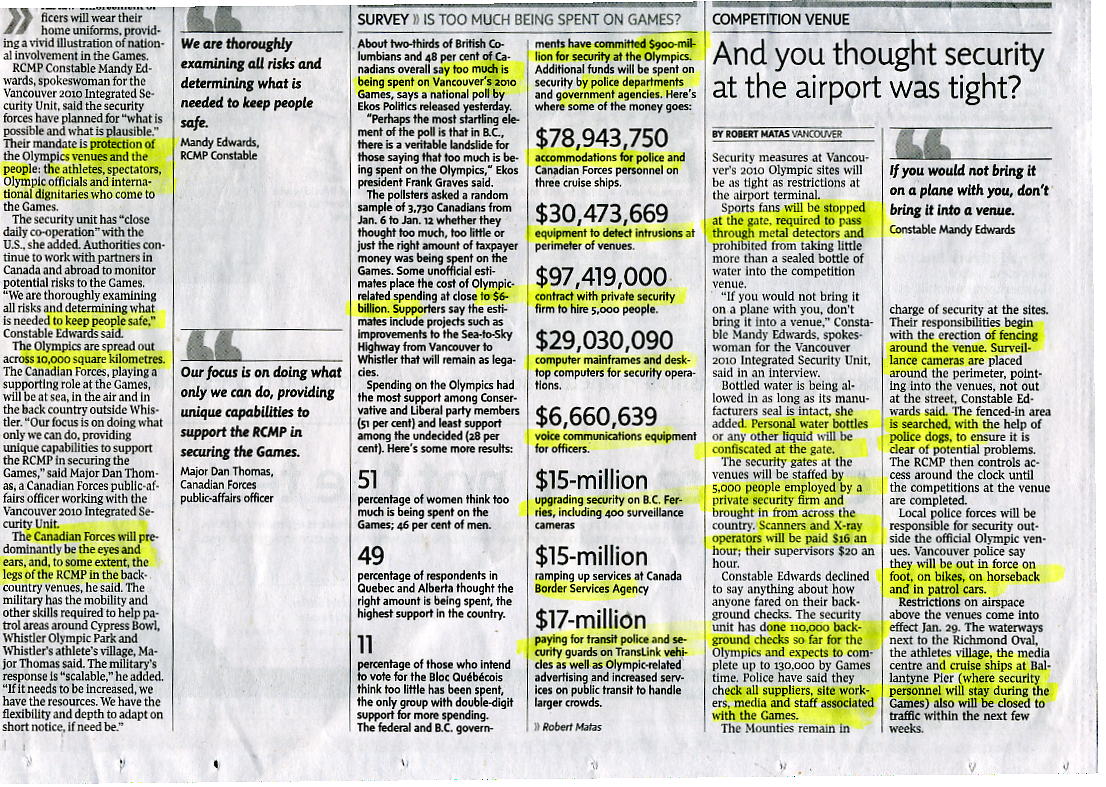 It occurs to me, and I assume it must occur to others, that if there really are terrorists "out there", wouldn't they be more likely to be planning an "attack" at some place other than the Vancouver Olympics where the whole world is allegedly waiting and watching for them? ~ Jackie Jura
