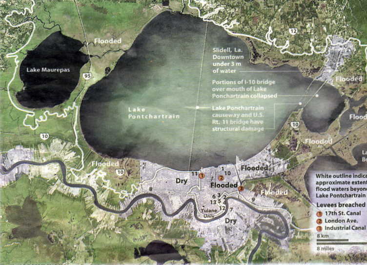 According to reports on Sept. 1, the Army Corps of Engineers said it was having trouble getting the sandbags to the affected site because the waterways were blocked by boats, debris, and loose barges. By Sunday, authorities reported progress in fixing the levees. Military helicopters continued to drop huge sandbags. But because Lake Ponchartrain's level has started to drop, some of the water is flowing out of the city and back over the levee into the lake.