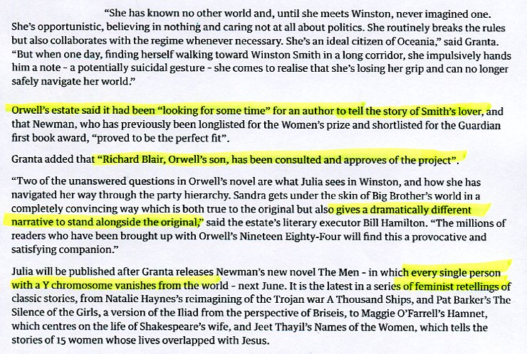 "The estate of George Orwell has approved a feminist retelling of Nineteen Eighty-Four, which reimagines the story from the perspective of Winston Smith's lover Julia... In JULIA by Sandra Newman, the incidents of Nineteen Eighty-Four are seen through the woman's eyes... Publisher Granta said that Julia understands the world of Oceania "far better than Winston and is essentially happy with her life"...