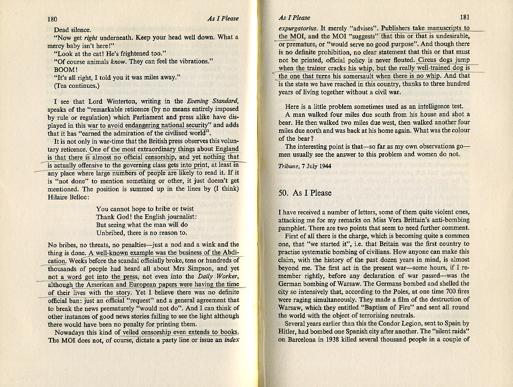 Nowadays this kind of veiled censorship even extends to books. The M.O.I.* does not, of course, dictate a party line or issue an index expurgatorius. It merely 'advises'. Publishers take manuscripts to the M.O.I. and the M.O.I. 'suggests' that this or that is undesirable, or premature, or 'would serve no good purpose'. And though there is no definite prohibition, no clear statement that this or that must not be printed, official policy is never flouted. Circus dogs jump when the trainer cracks his whip, but the really well-trained dog is the one that turns his somersault when there is no whip. And that is the state we have reached in this country thanks to three hundred years of living together without a civil war.