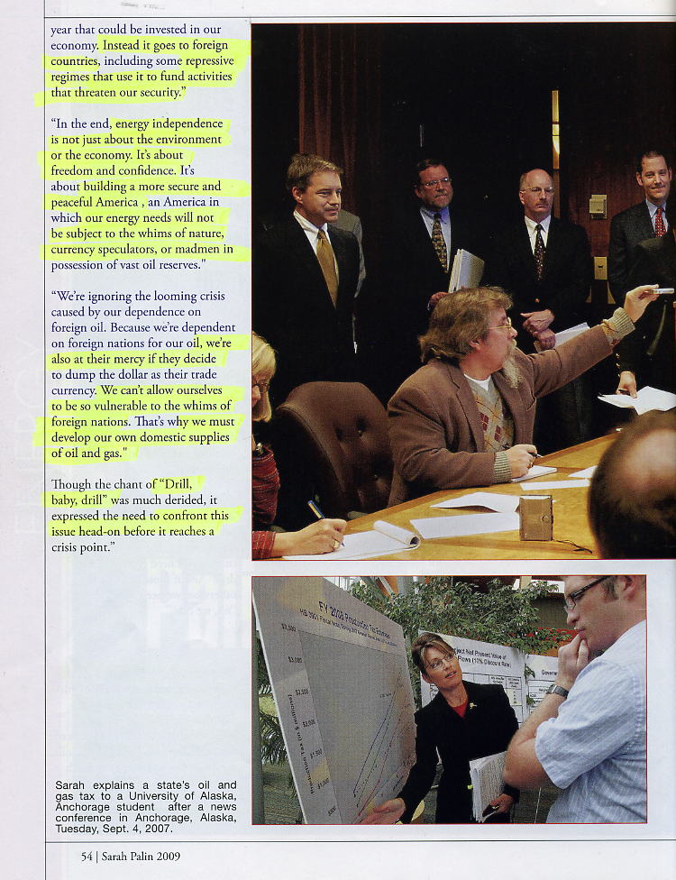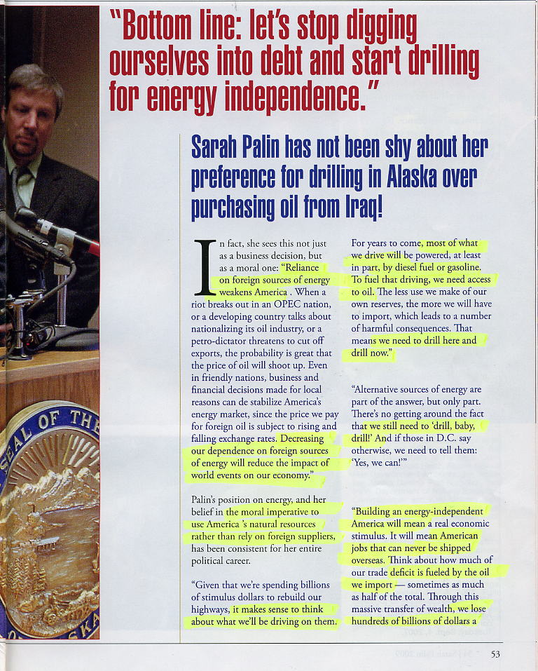 "Bottom line: let's stop digging ourselves into debt and start drilling for energy independence". Sarah Palin has not been shy a bout her preference for drilling in Alaska over purchasing oil from Iraq! In fact she sees this not just as a business decision, but as a moral one: "eliance on foreign sources of energy weakes America.... Decreasing our dependendence on foreign sources of energy will reduce the impact of world events on our economy" Palin's position on energy and her belief in the moral imperative to use America's natural resources rather than rely on foreign suppliers, has been consistent for her entire political career.... "Given that we're spending billlions of stiumulus dollars to rebuild our highways, it makes sense to think about what we'll be driving on them. For years to come, most of what we drive will be powered, at least in party, by diesel fuel or gasoline. To fuel that driving, we need access to oil.... That means we need to drill here and drill now."...). Go to SARAH IS SPIRIT OF AMERICA