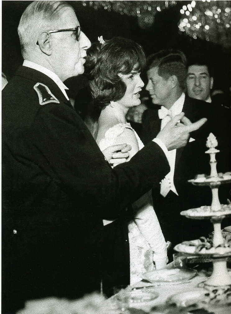 "But now it was time for luncheon. Jacqueline sat by the General and engaged him in an animated conversation in French about French history -- Louis XVI, and the Duc d'Angouleme and the dynastic complexities of the later Bourbons -- until de Gaulle leaned across the table and told Kennedy that his wife knew more French history than most French women. (Kennedy, delighted, later said that it was as if Mme. de Gaulle had sat next to him and asked him all about Henry Clay.) It was a gay occasion....