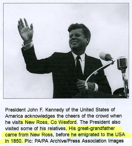 "...When my great-grandfather left here to become a cooper in East Boston, he carried nothing with him except two things: a strong religious faith and a strong desire for liberty. I am glad to say that all of his great-grandchildren have valued that inheritance. If he hadn't left, I would be working over at the Albatross Company, or perhaps for John V Kelly. In any case, we are happy to be back here. About 50 years ago, an Irishman from New Ross traveled down to Washington with his family, and in order to tell his neighbours how well he was doing, he had his picture taken in front of the White House and said, "This is our summer home. Come and see us." Well, it's our home also in the winter, and I hope you will come and see us. Thank you."