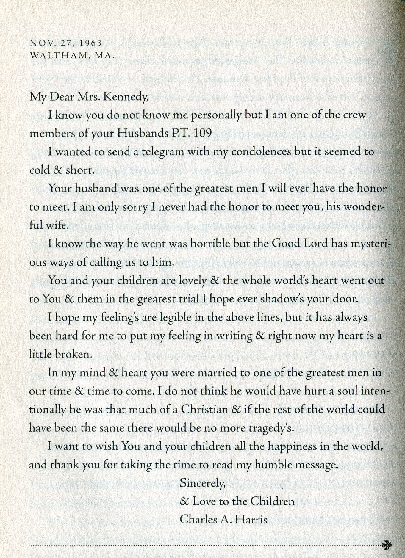 JFK PT-109 HARRIS LETTER TO JACKIE