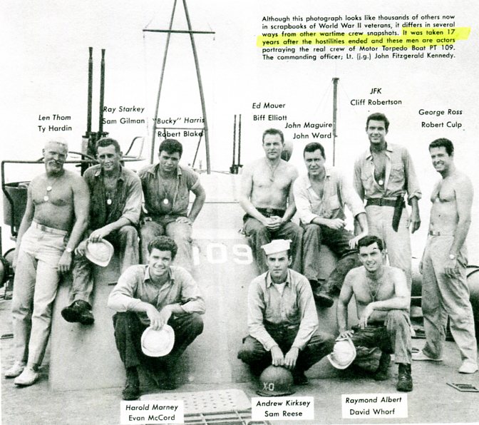 In your movie poster photo I was wondering which actor was Maguire and went searching on my website for photos of the crew to see if they were look-alikes as are Ty Hardin playing Leonard Thom and Cliff Robertson playing JFK (the only two I knew). Then it dawned on me that the actors were probably staging a re-enactment of the famous photo of JFK and crew posing aboard the PT 109 and would be in the same positions. After comparing the poster photo to the original photo I concluded that the actor playing Maguire was next to the actor playing JFK. See JFK PT 109 CREW and WHO'S WHO ON PT 109 and JFK SOLOMON SWIMS SAVED SURVIVORS