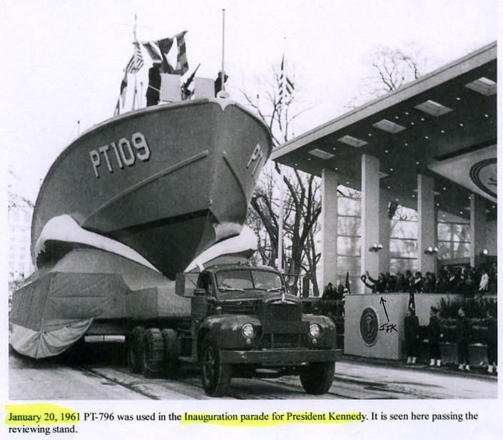 The thrill of a lifetime for the PT 109 crew (and a surprise for President Kennedy during the Inaugural Parade) was standing at attention on a replica PT-109 float, saluting their old skipper -- now their Commander in Chief.