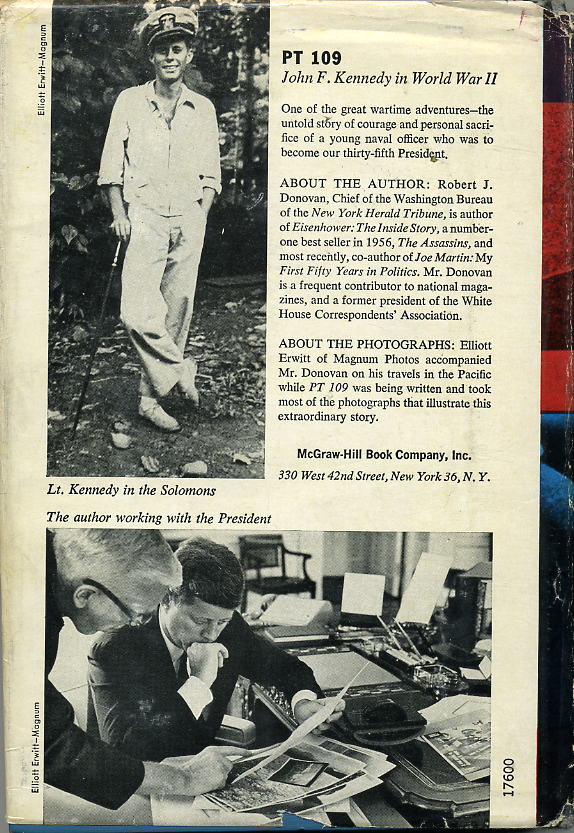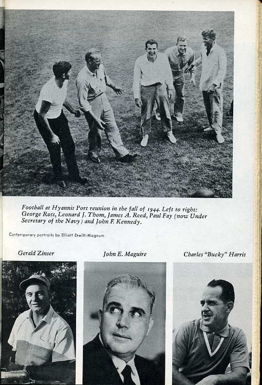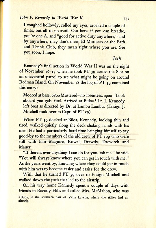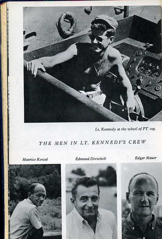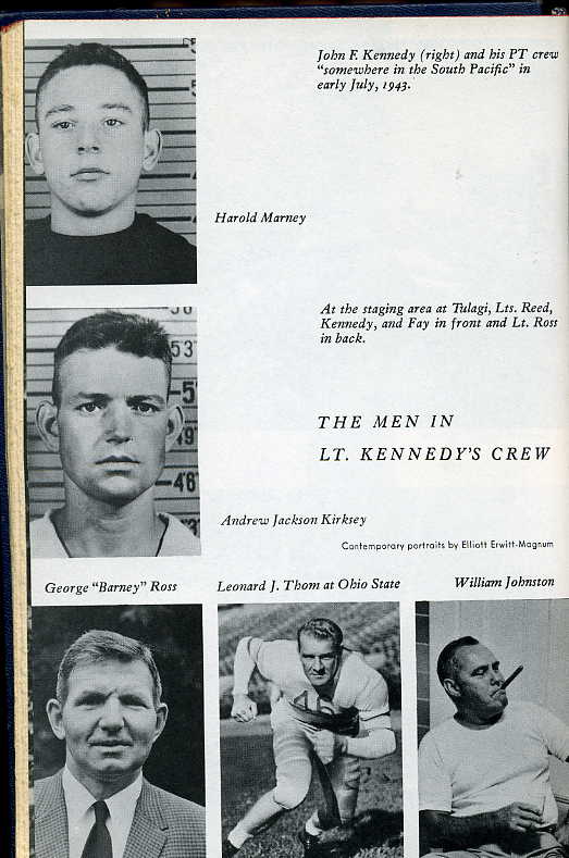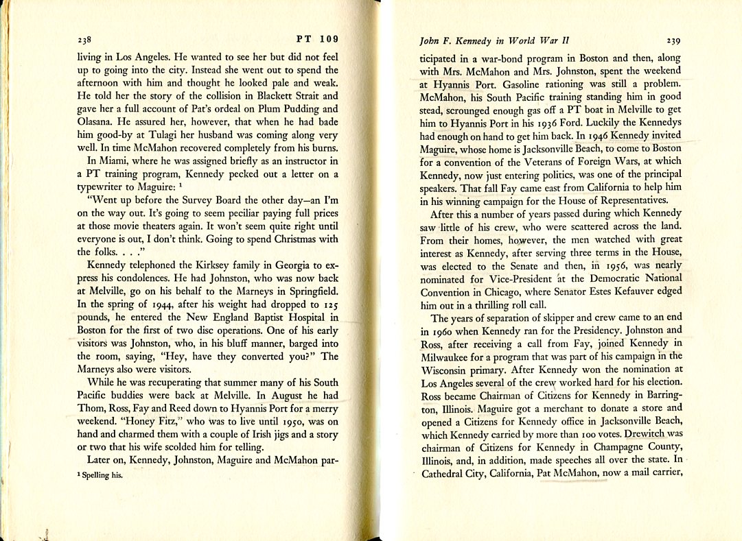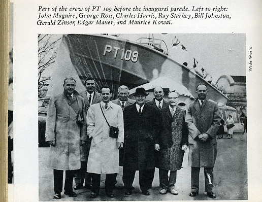 "...In the spring of 1944, after his weight had dropped to 125 pounds, Kennedy entered the New England Baptist Hospital in Boston for the first of two disc operations... While he was recuperating that summer many of his South Pacific buddies were back at Melville... Later on, Kennedy, Johnston, Maguire and McMahon participated in a war-bond program in Boston and then, along with Mrs McMahon and Mrs Johnston, spent the weekend at Hyannis Port.... In 1946 Kennedy invited Maguire, whose home is Jacksonville Beach, to come to Boston for a convention of the Veterans of Foreign Wars, at which Kennedy, now just entering politics, was one of the principal speakers. That fall Fay came east from California to help him in his winning campaign for the House of Representatives. After this a number of years passed during which Kennedy saw little of his crew, who were scattered across the land. From their homes, however, the men watched with great interest as Kennedy, after serving three terms in the House, was elected to the Senate and then, in 1956, was nearly nominated for Vice-President at the Democratic National Convention in Chicago... The years of separation of skipper and crew came to an end in 1960 when Kennedy ran for the Presidency... Maguire got a merchant to donate a store and opened a Citizens for Kennedy office in Jacksonville Beach, which Kennedy carried by more than 100 votes...."