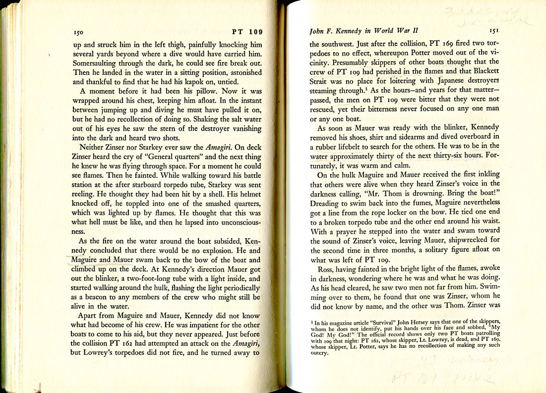 ...As the fire on the water around the boat subsided, Kennedy concluded that there would be no explosion. He and Maguire and Mauer swam back to the bow of the boat and climbed up on the deck. At Kennedy's direction Mauer got out the blinker, a two-foot-long tube with a light inside, and started walking around the hulk, flashing the light periodically as a beacon to any members of the crew who might still be alive in the water... As soon as Mauer was ready with the blinker, Kennedy removed his shoes, shirt and sidearms and dived overboard in a rubber lifebelt to search for the others. He was to be in the water approximately thirty of the next thirty-six hours. Fortunately, it was warm and calm. On the hulk Maguire and Mauer received the first inkling that others were alive when they heard Zinser's voice in the darkness calling, "Mr Thom is drowning. Bring the boat!" Dreading to swim back into the fumes, Maguire nevertheless got a line from the rope locker on the bow. He tied one end to a broken torpedo tube and the other end around his waist. With a prayer he stepped into the water and swam toward the sound of Zinser's voice, leaving Mauer, shipwrecked for the second time in three months, a solitary figure afloat on what was left of PT 109...
