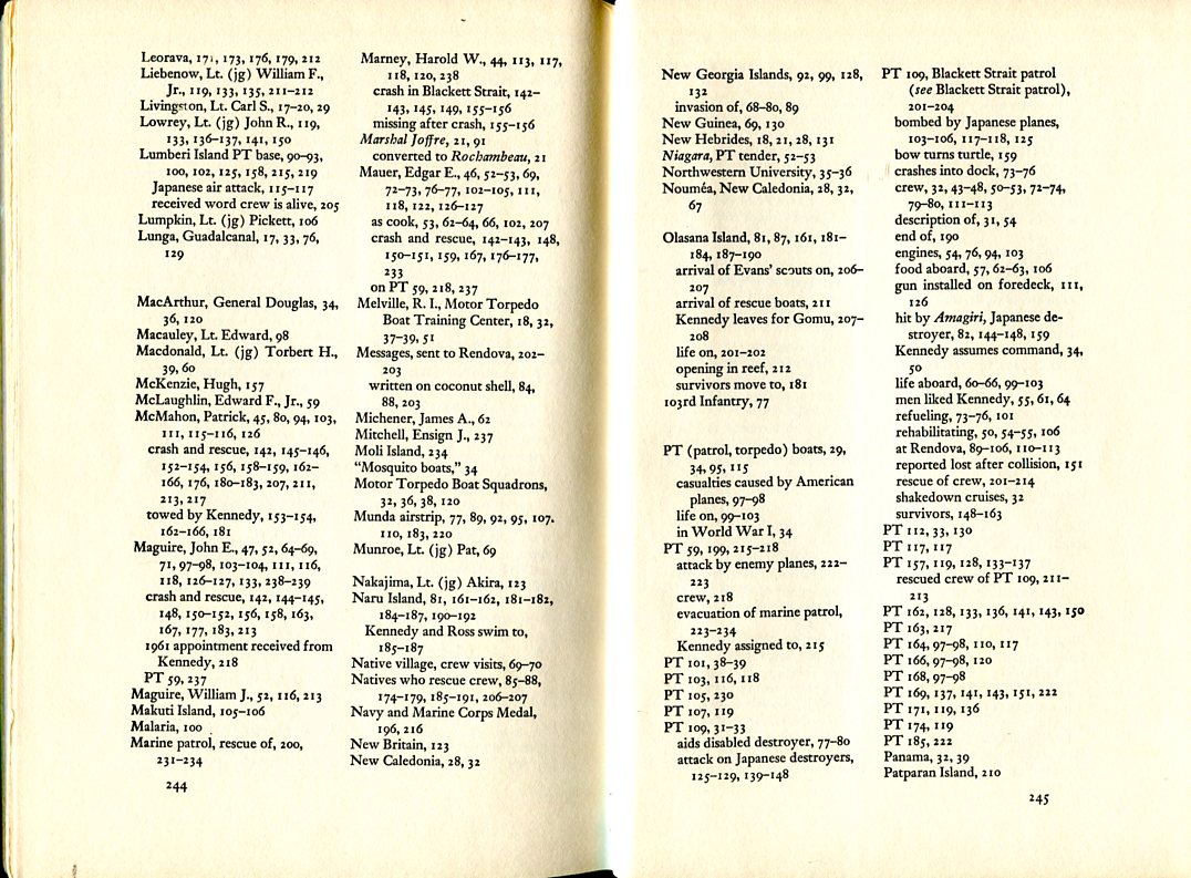 Maguire, as can be seen in the index, was a big part of the PT-109 story and that is reflected in the book and the movie. After PT 109 was rammed by the Japanese destroyer the bow was separated from the stern, and by the time JFK got on his feet after being thrown against the back of the cockpit, there were only three other crew with him -- Maguire (who was beside him in the cockpit), Mauer and Ross. The stern had already sunk and flames on the ocean were surrounding what remained of the boat. JFK was worried the gasoline tank would explode and ordered everyone into the water. Maguire was afraid to jump in because his rubber lifebelt had deflated and he wanted to get a spare one from the charthouse. JFK promised he wouldn't leave him and waited until Maguire had retrieved it, and then they jumped overboard together. That was one of many examples of JFK not abandoning his men -- even at risk of his own life. Maguire soon had a chance to prove his courage too. Here's the passage from the book, the pages scanned above: