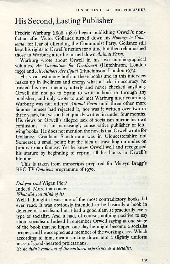 Below is a scan and excerpts of Warburg's interview from the book ORWELL REMEMBERED by Coppard and Crick, published in 1984. The interview was conducted in 1970 for the BBC TV program Omnibus -- and includes some of Warburg's comments about Jura and being Orwell's publisher. Warburg had previously published HOMAGE TO CATALONIA and ANIMAL FARM when Orwell couldn't get anyone else. At that time Warburg was just starting out in the publishing business and had no successful books or authors on his list -- but his faith in Orwell was richly rewarded -- in every sense of the word.