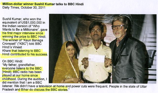 watch Indian million dollar gameshow win inspires local poor, BBC, Nov 7, 2011