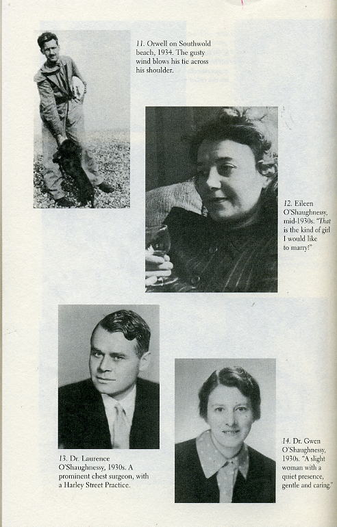 ...One of these guests was a slender woman with broad shoulders and dark brown hair. She was nearly thirty and was a graduate student working on a Master's degree in educational psychology. Her name was Eileen Maud O'Shaughnessy, and Orwell was attracted to her from the moment she walked into the room. They spent much of the evening talking, and at the end of the party he walked her to the bus stop. When he came back to the flat, he went to Rosalind's room and announced to her that Eileen was "the sort of girl I'd like to marry". This woman, who would indeed become George Orwell's wife, was an exceptional person. She came from a proud Irish family who had come to England in the early nineteenth century and had settled on the Tyneside. The daughter of a Collector of Customs, she was born on 25 September 1905 in South Shields. There was only one other child in the family, her older brother Laurence, and she was devoted to him. Both children received excellent educations. He studied medicine at the University of Durham and in Berlin, and was the winner of four scholarships. At the age of twenty-six he was elected a Fellow of the Royal College of Surgeons... At the time she met her future husband, Eileen was living at 24 Croom's Hill, which borders Greenwich Park. The house belonged to her brother and his wife, Gwen, who was also a doctor. It was a Georgian house with elegant bay windows on two of its three floors, and was originally the home of an astronomer at the Royal Observatory. Eileen was happy there, and enjoyed playing at least a small part in her brother's brilliant career, but she was also looking forward to having a career of her own as an educational psychologist. And then Orwell came into her life....