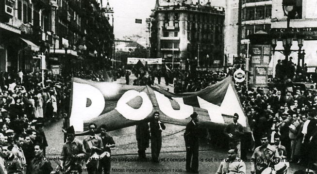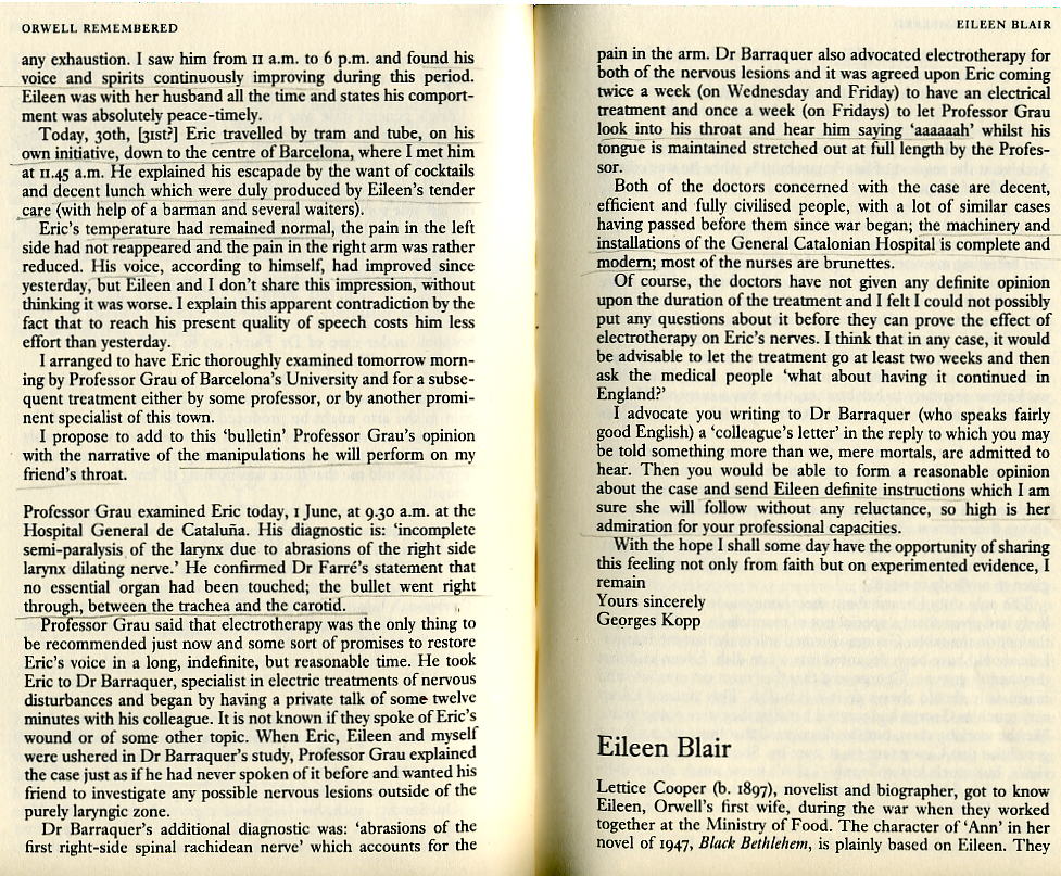 1937: In early January he went to the front line at Alcubierre. Towards the end of the month he transferred, as a corporal, to the Independent Labour Party contingent which had arrived from England to serve with the POUM militia on the Aragon front. In February Eileen BLair arrived in Barcelona and about 13 March she spent two days at the front near Monfloorite with the ILP contingent. On 8 March THE ROAD TO WIGAN PIER was published by Victor Gollancz in a public edition and as a Left Book Club choice. At the end of April Orwell went on leave to Barcelona and applied for his discharge papers, intending to join the International Brigade to get to Madrid, but the Communist attempt to suppress the revolutionary parties, including the POUM, in Barcelona in the first week in May made Orwell henceforward a bitter opponent of Stalinist Communism. On 10 May he returned, as a second lieutenant, to the ILP contingent and, ten days later, he was wounded in the throat by a Fascist sniper... He convalesced until 14 June and, while he was at the front collecting his discharge papers, the POUM was declared illegal by the Spanish Government on 16 June. From 20 to 22 June he was in Barcelona on the run from the Communist police and, with his wife, managed to get across the French border on 23 June.
