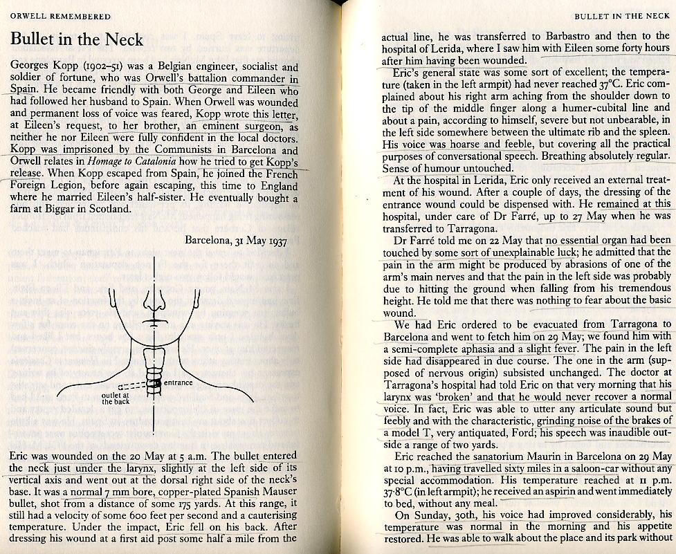 Eric was wounded the 20 May at 5 a.m. The bullet entered the neck just under the larynx, slightly at the left side of its vertical axis and went out at the dorsal right side of the neck's base. It was a normal 7 mm bore, copper-plated Spanish Mauser bullet, shot from a distance of some 175 yards. At this range, it still had a velocity of some 600 feet per second and a cauterising temperature. Under the impact, Eric fell on his back. After dressing his wound at a first aid post some half a mile from the actual line, he was transferred to Barbastro and then to the hospital of Lerida, where I saw him with Eileen some 50 hours after him having been wounded...