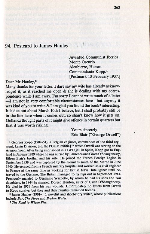 Many thanks for your letter. I dare say my wife has already acknowledged it, as it reached me open & she is dealing with my correspondence while I am away. I'm sorry I cannot write much of a letter -- I am not in very comfortable circumstances here [Orwell was serving on the Aragon front]. But anyway it was kind of you to write & I am glad you found the book [The Road to Wigan Pier] interesting. It is due out about March 10th I believe, but I shall probably still be in the line when it comes out, so shan't know how it gets on. Gollancz thought parts of it might give offence in certain quarters [to Stalinists, communists and fellow-travellers] but that is worth risking.