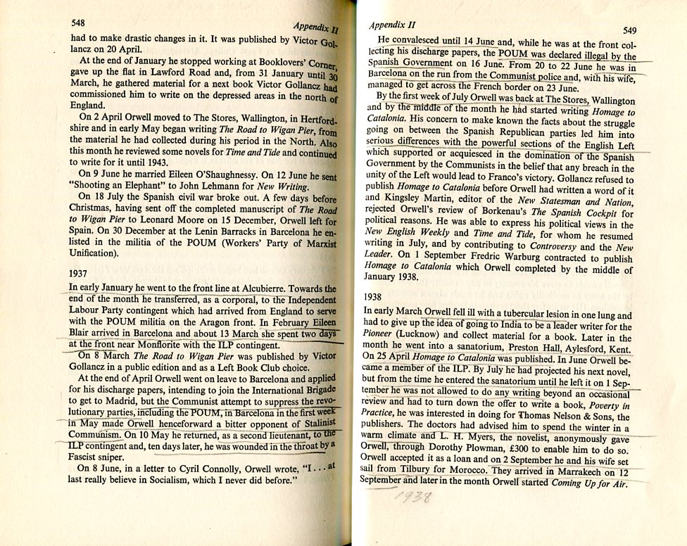 By the first week of July Orwell was back at The Stores, Wallington and by the middle of the month he had started writing HOMAGE TO CATALONIA. His concern to make known the facts about the struggle going on between the Spanish Republican parties led him into serious differences with the powerful sections of the English Left which supported or acquiesced in the domination of the Spanish Government by the Communists in the belief that any breach in the unity of the Left would lead to Franco's victory. Gollancz refused to publish HOMAGE TO CATELONIA before Orwell had written a word of it and Kingsley Martin, editor of the NEW STATESMAN AND NATION, rejected Orwell's review of Borkenau's THE SPANISH COCKPIT for political reasons... On 1 September Fredrick Warburg contracted to publish HOMAGE TO CATALONIA which Orwell completed by the middle of January 1938.