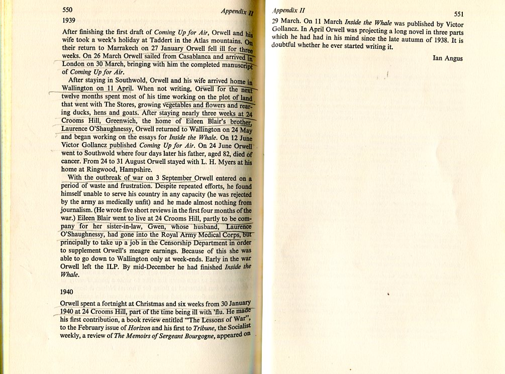 Eileen Blair went to live at 24 Crooms Hill, partly to be company for her sister-in-law, Gwen, whose husband, Laurence O'Shaughnessy, had gone into the Royal Army Medical Corps, but principally to take up a job in the Censorship Department in order to supplement Orwell's meagre earnings. Because of this she was able to go down to Wallington only at week-ends. Early in the war Orwell left the ILP. By mid-December he had finished INSIDE THE WHALE.