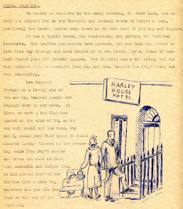When I first learned that Laurence O'Shaughnessy had his medical office on Harley street in London, it reminded me of one of Granny's sketches from the journal she'd written of that trip. Their hotel, the Harley House near Russell Square, wasn't exactly on Harley street, but nearby in the heart of the medical district near the University College Hospital, where Orwell died. The area, ie Fitzrovia and Bloomsbury and Fleet Street is also Orwell's old stomping grounds where he lived and worked duing WWII. I retraced Orwell's footsteps there during my HOMAGE TO ORWELL in 2003. My grandmother did the writing of their trip journal and my grandfather typed it up on his old Remington portable -- the exact same model Orwell used to type 1984 and all his other books and journalism. See ORWELL'S TYPEWRITER MY GRANDFATHER'S