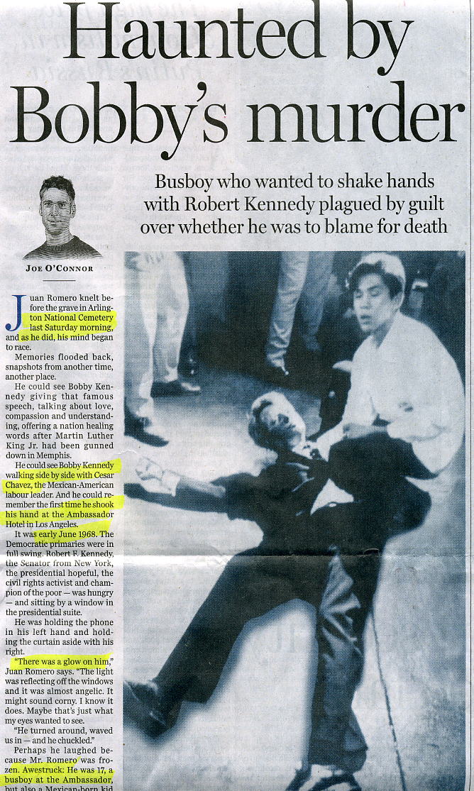 Hotel busboy haunted by Bobby's murder, National Post, Nov 29, 2010 (Juan Romero knelt before the grave in Arlington National Cemetery last Saturday morning, and as he did, his mind began to race. Memories flooded back, snapshots from another time, another place...It was early June, 1968...)