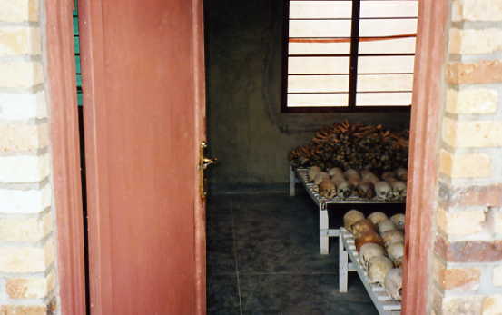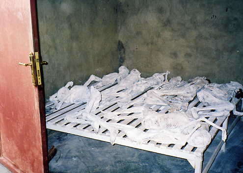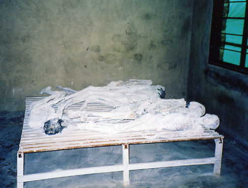 A picture's worth a thousand words and it's pretty self-explanatory that what we are seeing are the contorted skeletons of Tutsis massacred that April night in 1994 - twelve years ago. Their bodies were dug out from the pits and covered with lime to disinfect and preserve them. They lie here, in the classrooms, as non-verbal testimony of what happened to them here.