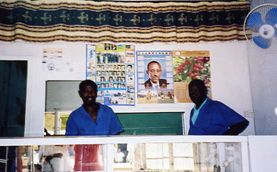 I asked the shop owner if I could take a picture of the picture and he said "Yes" and then asked if he could be in it as well. I said "Sure", and then another man came out from behind the curtain and said he wanted to be in the picture too. I asked them if they liked President Kagame and they said "Yes, Yes" and then happily posed with him in between. The reflection of my orange blouse can be seen in the glass under the counter as I snap the photo. I thanked them very much and told them they'd be famous one day because I'd be putting that picture on my website for all the world to see.
