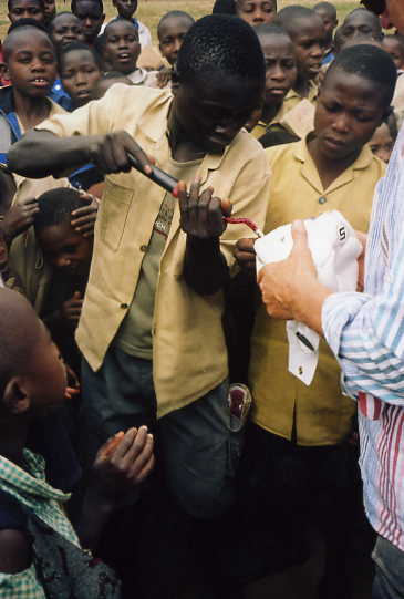 After it was blown up a couple of teachers strolled over to see what all the commotion was about and posed for a photo with the ball. That's our driver, the tall young man on the left, smiling down at the kids. Before getting back into the vehicle Bob tossed the ball up into the air and then "headed" it far into the field, which got a round of cheers as they all gleefully ran after it.