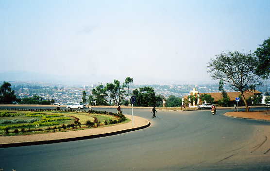 The breathtaking view in the top photo below is what a person sees as they come down the hill from the main commercial area in Kigali. That's the Saint Famille Church on the right.