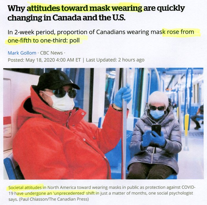 Attitudes toward mask wearing quickly changing in Canada & USA, CBC News, May 18, 2020