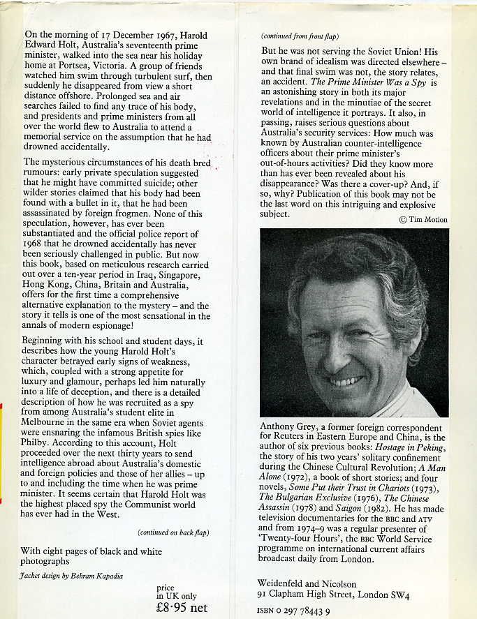 Beginning with his school and student days, it describes how the young Harold Holt's character betrayed early signs of weakness, which, coupled with a strong appetite for luxury and glamour, perhaps led him naturally into a life of deception, and there is a detailed description of how he was recruited as a spy from among Australia's student elite in Melbourne in the same era when Soviet agents were ensnaring the infamous British spies like Philby. According to this account, Holt proceeded over the next thirty years to send intelligence abroad about Australia's domestic and foreign policies and those of her allies - up to and including the time when he was prime minister. It seems certain that Harold Holt was the highest placed spy the Communist world has ever had in the West.