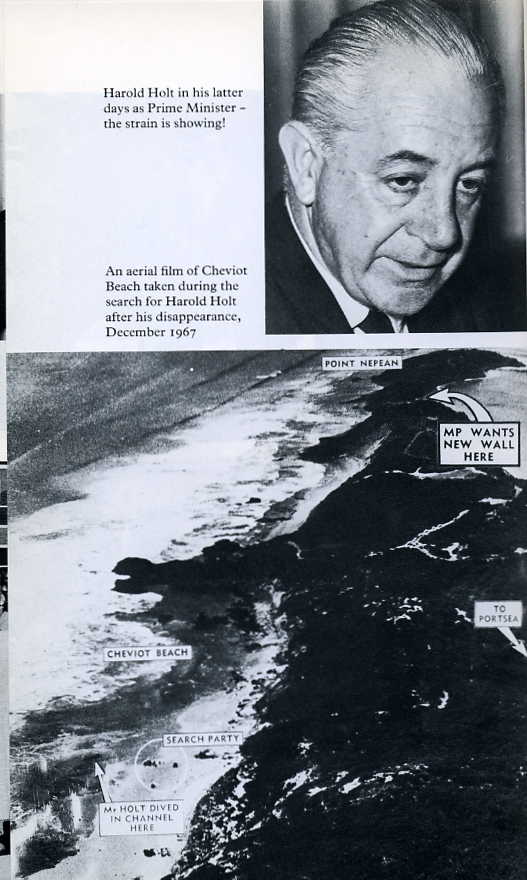 On the morning of 17 December 1967, Harold Edward Holt, Australia's seventeenth prime minister walked into the sea near his holiday home at Portsea, Victoria. A group of friends watched him swim through turbulent surf, then suddenly he disappeared from view a short distance offshore. Prolonged sea and air searches failed to find any trace of his body, and presidents and prime ministers from all over the world flew to Australia to attend a memorial service on the assumption that he had drowned accidently.